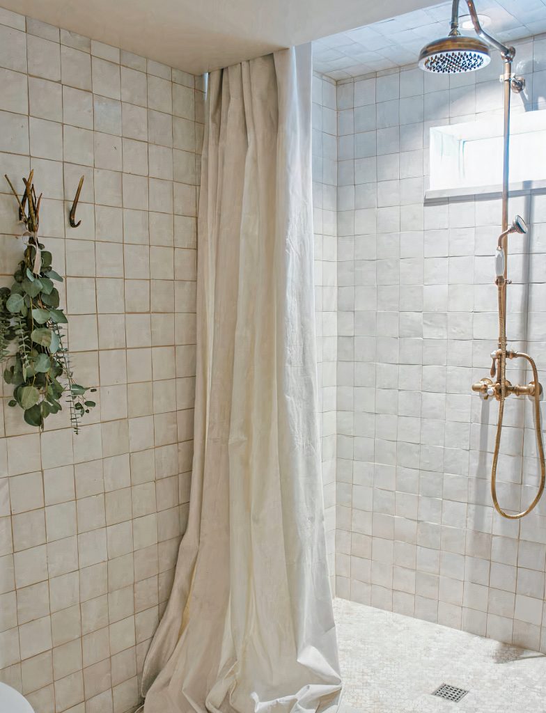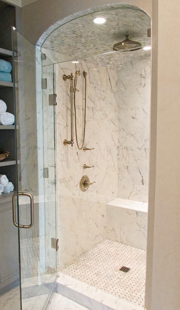 The tub-sized space is eliminated and replaced with a spacious walk-in, a dual-head design that provides plenty of room to move about while cleaning. Not only do they get all their shampoo bottles out during washing days, but there’s also shelf storage, so nothing falls beneath the surface!